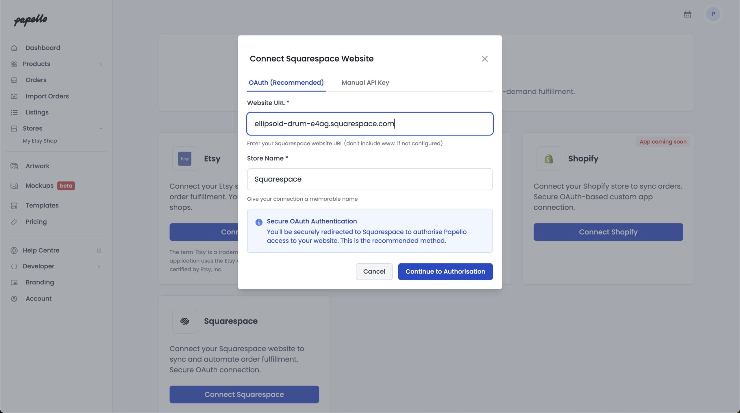 3. You will be redirected back to the Papello Dashboard. Your Squarespace shop is now connected to Papello!