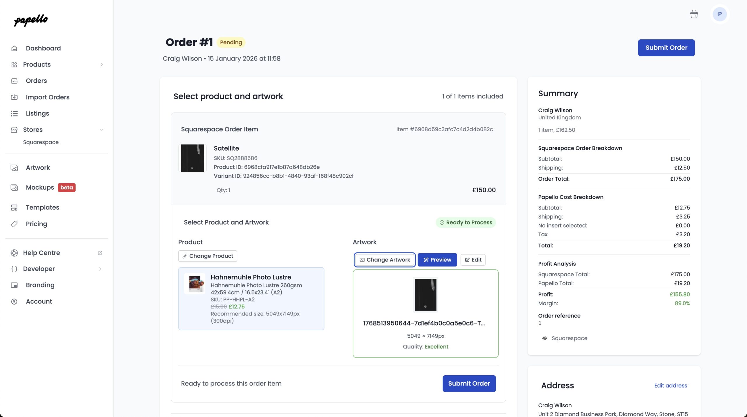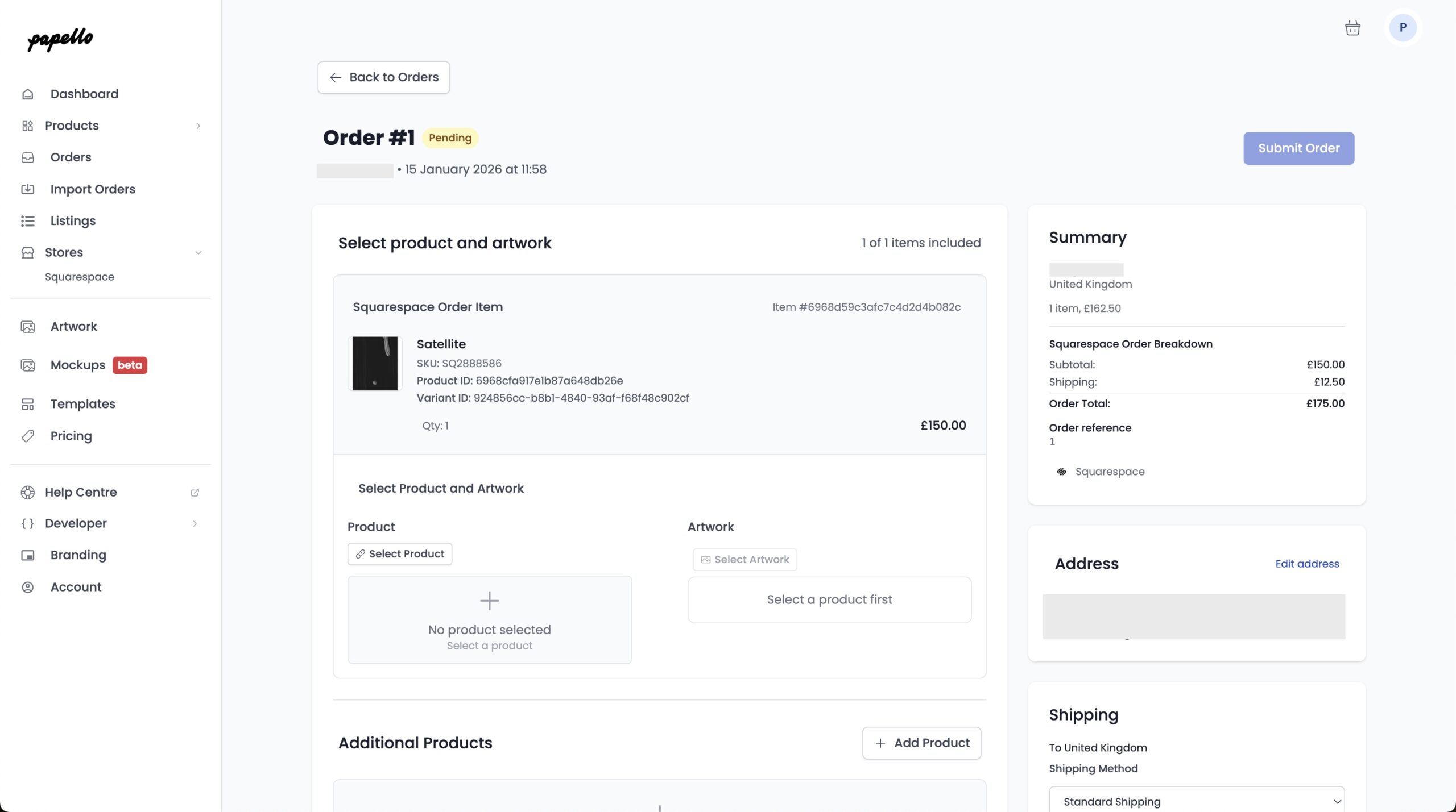 Click Submit Order to submit the order to Papello for fulfilment.